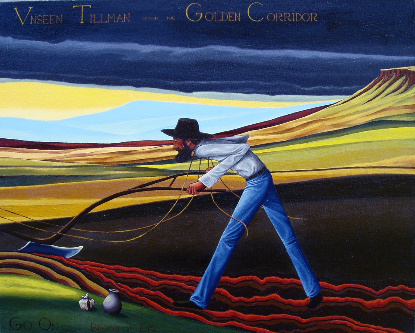 The Unseen Tillman, is a new painting that is recently completed and is for sale (see the works for sale page)-sold. This painting is an old subject from about nine years ago that has been revisited. The original was a much simpler image on a small panel and is in a private collection. This newer image is a symbol of unseen life being tilled and tended to. The plowing tillman is a silent toiler, working in the golden corridor. At times I paint more intuitively, without as clear an idea of what I wish to convey. Those paintings, like this one, always contribute segments of a visual language that is continually being learned, aquired and invented.