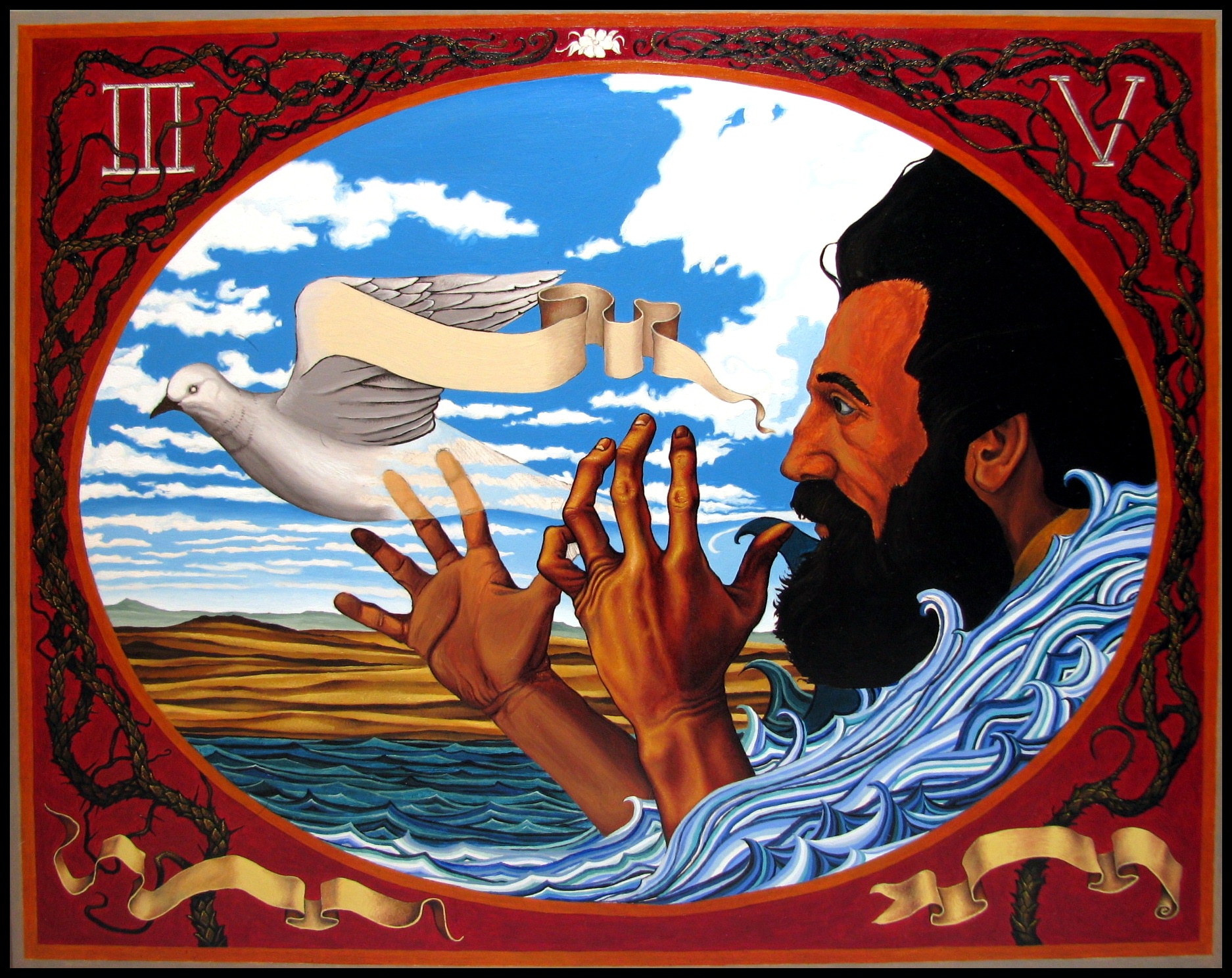 Here are some detail photographs of the recent progress on the painting, John the Baptist Breathing. The right hand (the further one) is still underpainting, while the left (the nearer) has just been newly painted- approaching what will be it’s final state. At the bottom of this post is a thumbnail of the whole painting. The details can be clicked on and enlarged as well.