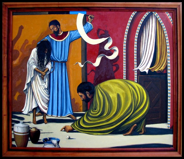 The Final Version of “The Stoning” Unfortunately, not a perfect photograph, this is the painting entitled, The Stoning. Based from a story in the Gospel of John, often refered to as the Woman Caught in Adultery, in which Jesus writes in the sand. The frame is made of cherry wood. Share this: Click to share on Facebook (Opens in new window) Facebook Click to share on X (Opens in new window) X Click to share on Pinterest (Opens in new window) Pinterest Like Loading... Related