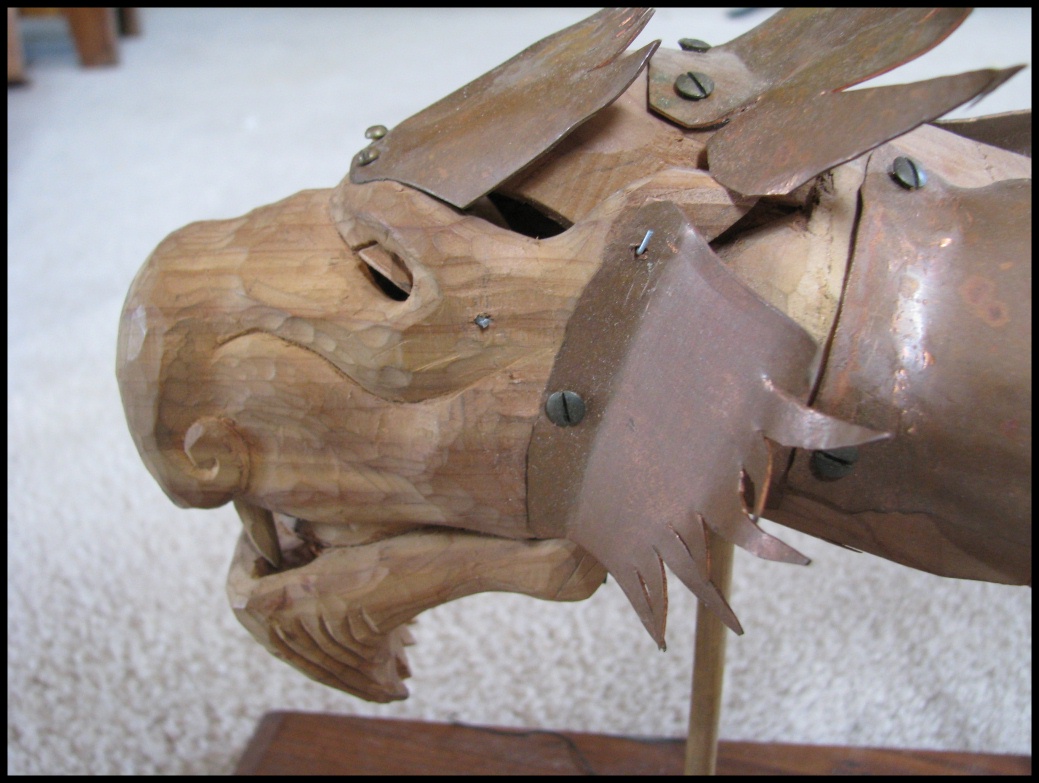 The School of the Transfer of Energy Puppet Theater is out of storage and is undergoing repairs and modifications- as well as new work. This is the head of Tremendum Goldbeard, made of copper and cedar, who will be a character in Part Two of The Two Deaths of John Beartrist Laceroot.
