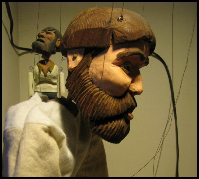 Jonas and Laceroot Puppets Jonas, the large marrionette in the foreground and John Beartrist Laceroot, a rod puppet, behind him. Share this: Click to share on Facebook (Opens in new window) Facebook Click to share on X (Opens in new window) X Click to share on Pinterest (Opens in new window) Pinterest Like Loading... Related