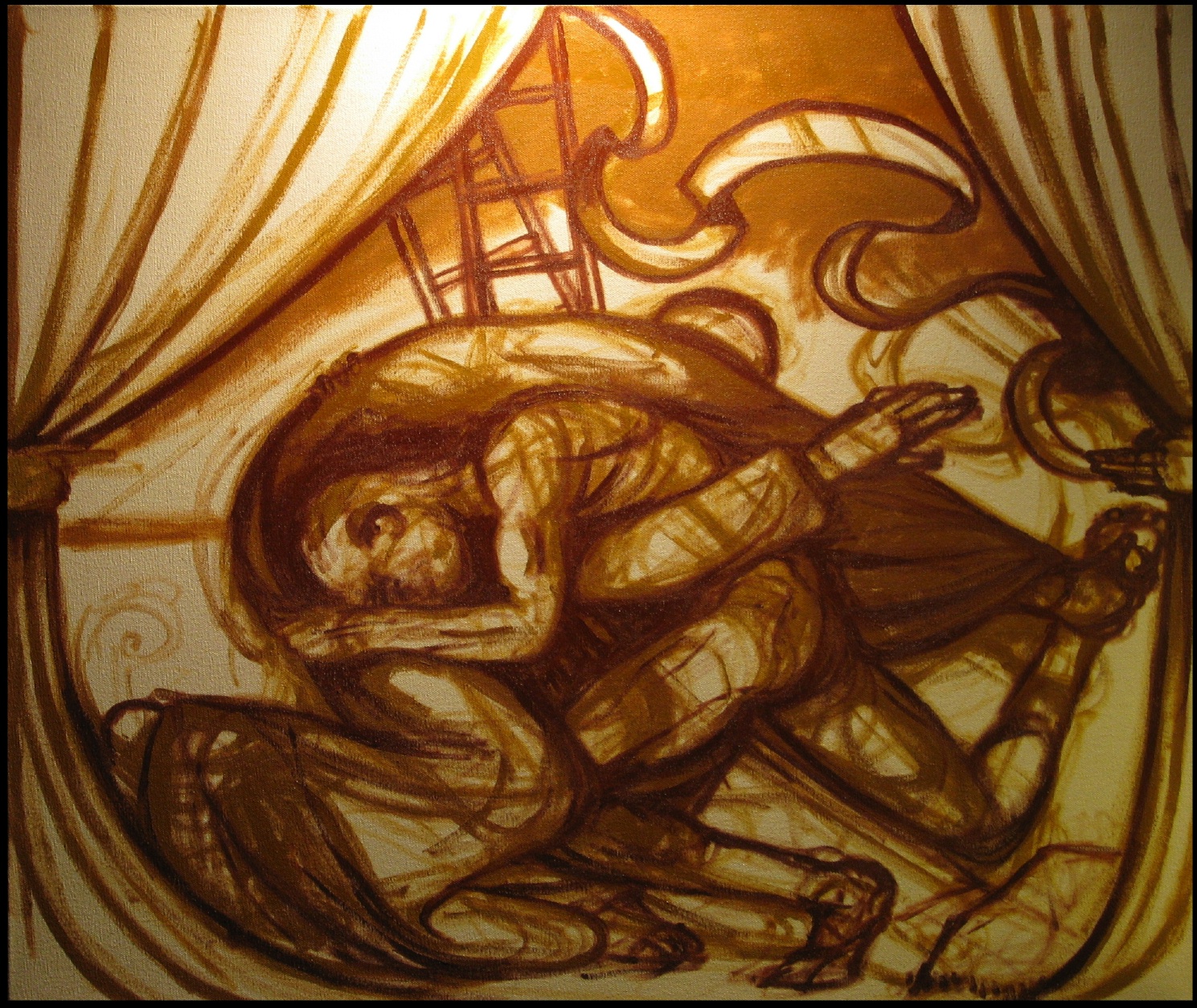 These are images from a new painting I am starting about Jacob when he is wrestling the Angel. This is a very enjoyable stage in painting on canvas- feeling out the forms with yellow ocher, then raw sienna, and burnt sienna. These pictures represent about five hours of work.