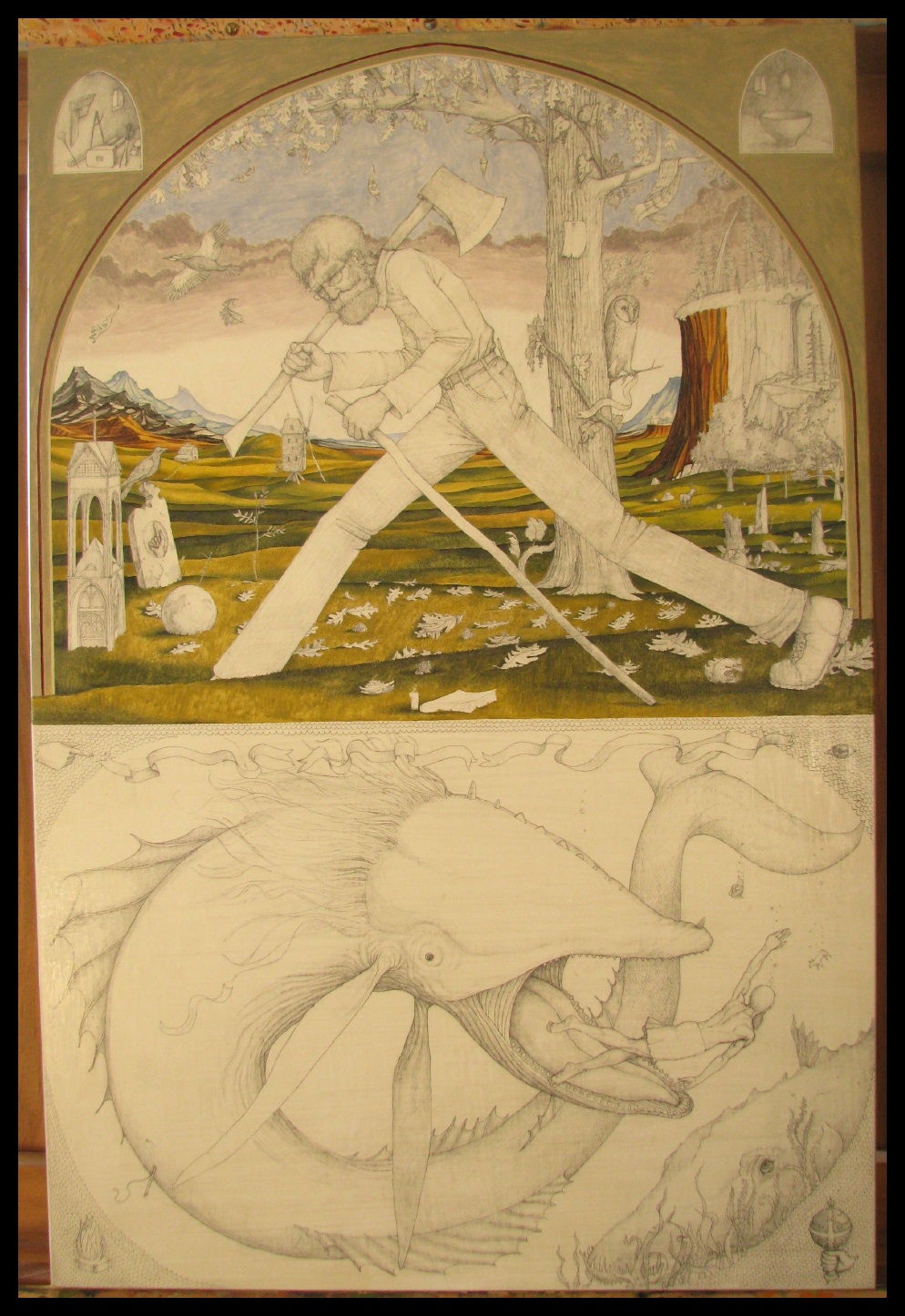 Walking Man and Jonah Underpainting Here is the beginnings of the under-painting -the first layer of many layers of paint- of the Walking Man section of the panel depicting Walking Man tromping across the ancient ocean and Jonah in the ancient ocean. a poor shot of the entire panel Share this: Click to share on Facebook (Opens in new window) Facebook Click to share on X (Opens in new window) X Click to share on Pinterest (Opens in new window) Pinterest Like Loading... Related