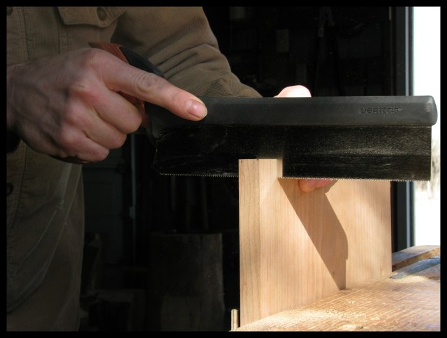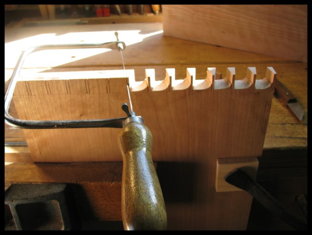 Here the dovetails have been cut and the piece is clamped together in order to mark precisely the corresponding pins.