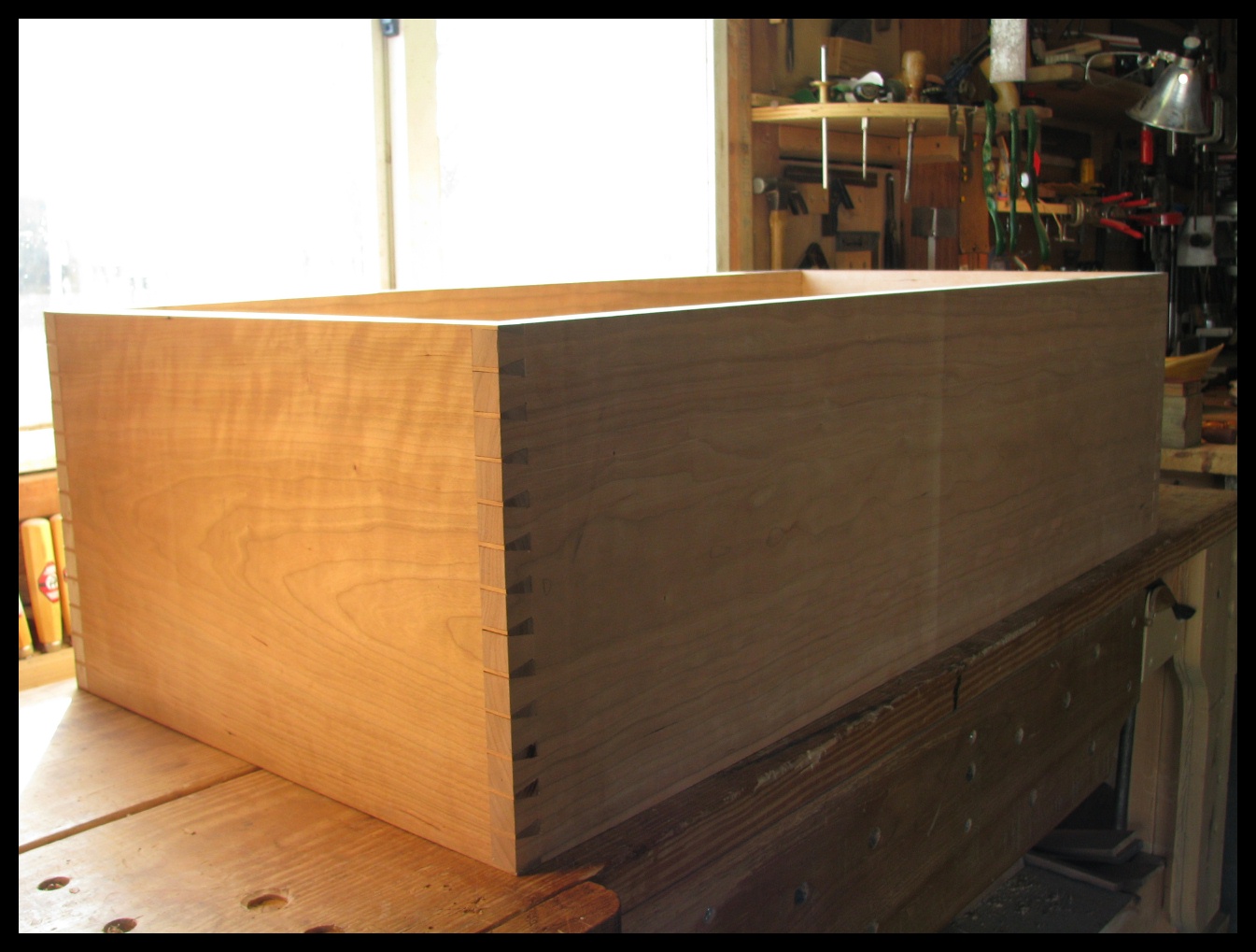 Pictured below is the beginings of a hope chest in cherry and walnut, primarily.  The pictures depict the joinery of the upper case of the chest, which is cherry, and will lit atop a narrower walnut case with a row of drawers.