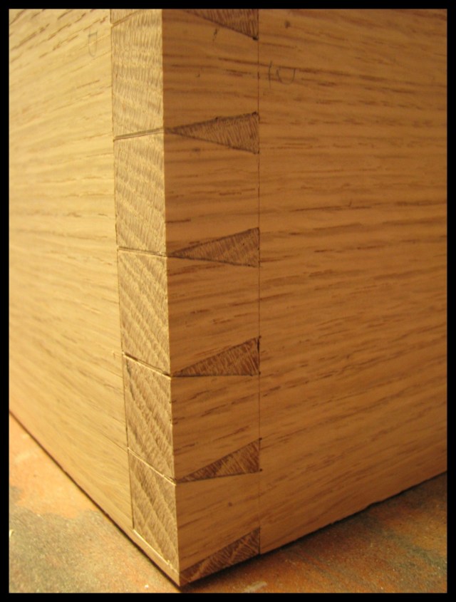 A dovetailed painting cabinet in quarter-sawn white oak. The tree grew along the Van Horn Branch just south of Boaz, Kansas, until it’s bank gave way. The panels will be gessoed and receive an oil painting. The cabinet is only dry fitted. It will not be glued up until the panels are fully prepared. In order to eliminate the center stiles of the frame and panel doors, the inside inch and 1/2 is a full tenon into the rail, while the rest of the panel will float in the customary grooves.
