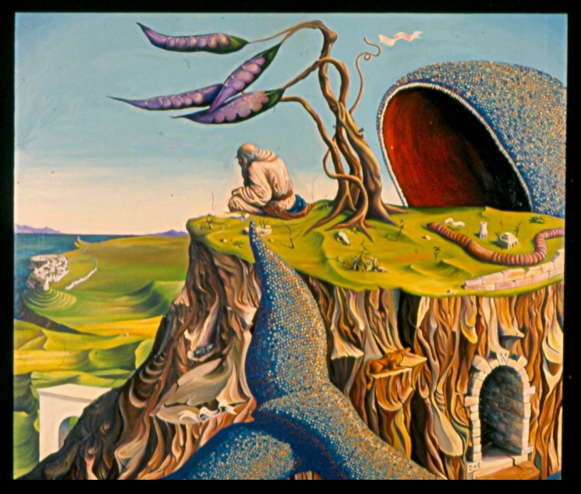 A painting of Jonah and the Gourd Vine, from 1999, painted on a mdf panel with mahogany veneer. Done while I was still in school, I had previously omitted it from the archives on this blog. It is in the same line of the paintings I am now doing- and have been doing since around 1999, so it now seems appropriate to add this and a few others from the last few semesters of my schooling to the paintings archive page.
