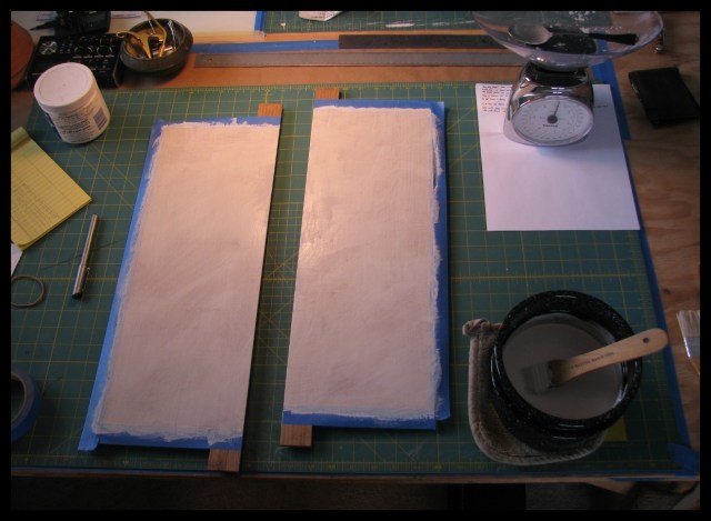 Over the past week, the white oak panels for the painting cabinet were gessoed using a traditional cooked recipe of rabbit skin glue, and ground calcium carbonate.