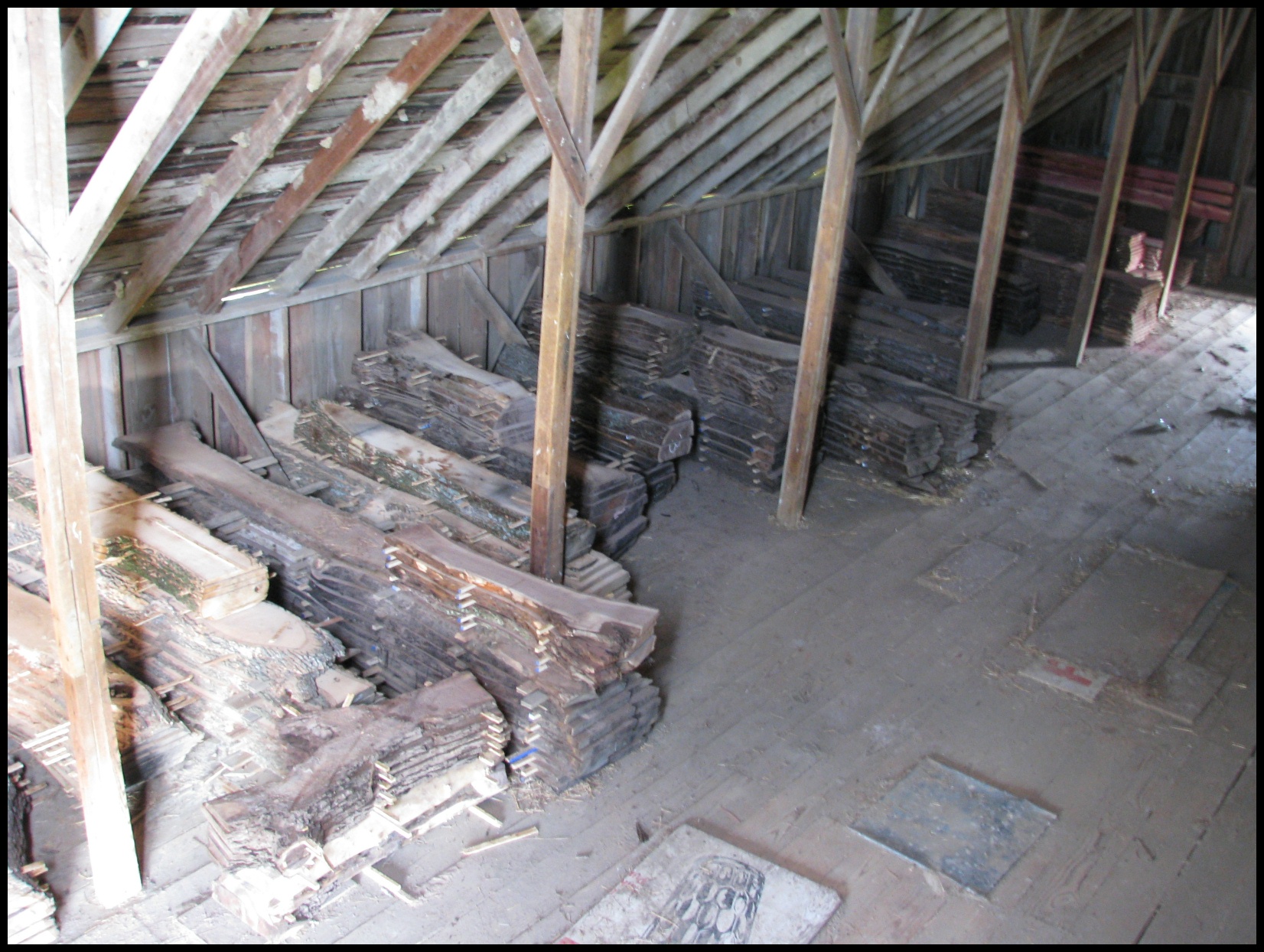 A hay loft full of lumber, almost everything was plain-sawn into boards and slabs from 4/4 up to a few 6″ slabs, all with natural edges remaining.