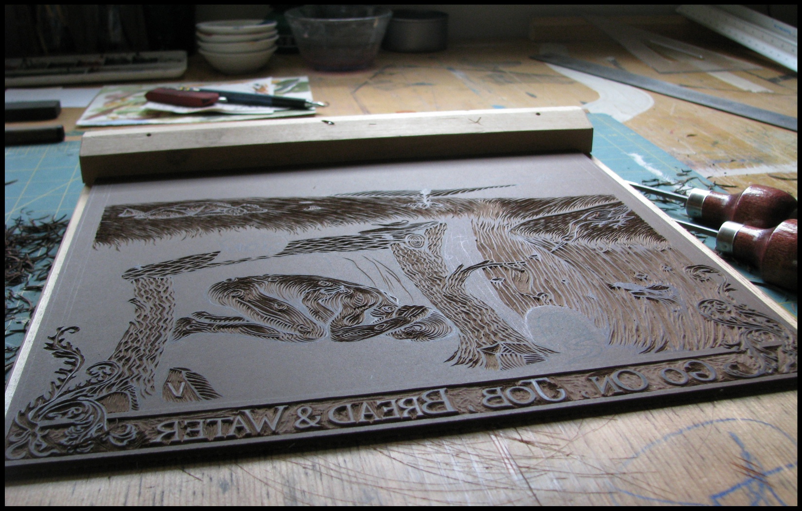 Go On, Job, Bread and Water (2) Midway through cutting the linoleum. Share this: Click to share on Facebook (Opens in new window) Facebook Click to share on X (Opens in new window) X Click to share on Pinterest (Opens in new window) Pinterest Like Loading... Related