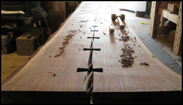 The following are a series of photos of the construction of what I have chosen to call a “walnut long table”, featuring a large center cut black walnut slab about 2″ thick from Fall River, KS.   The legs are also black walnut from Boaz, KS.