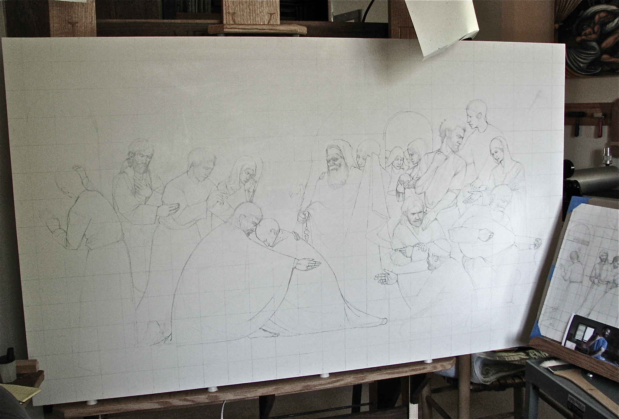 Thomas: New Characters Here is the Thomas panel in it’s present state, and a detail of three new characters to the left of Jesus and Thomas. From left, bearded disciple (not sure who), John, and Mary Magdalene. Share this: Click to share on Facebook (Opens in new window) Facebook Click to share on X (Opens in new window) X Click to share on Pinterest (Opens in new window) Pinterest Like Loading... Related