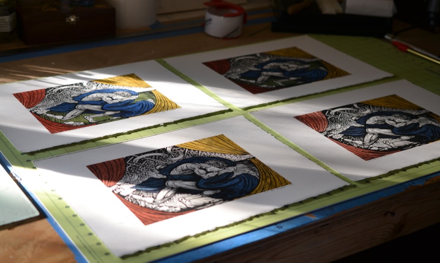 Plenty of two-dimensional work today:  First, some hand-colored prints of Jacob Wrestling the Angel of God.  A few of these are available if they strike you.  Next, are some studies for a large, 18″ x 12″, lino-cut of Obed Edom.  Finally, a few more prints and drawings.