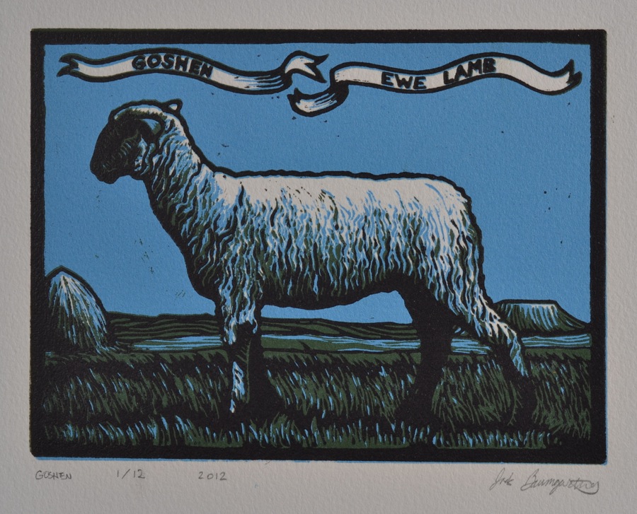 Goshen Ewe-Lamb, 3-color lino-cut, for sale on Etsy