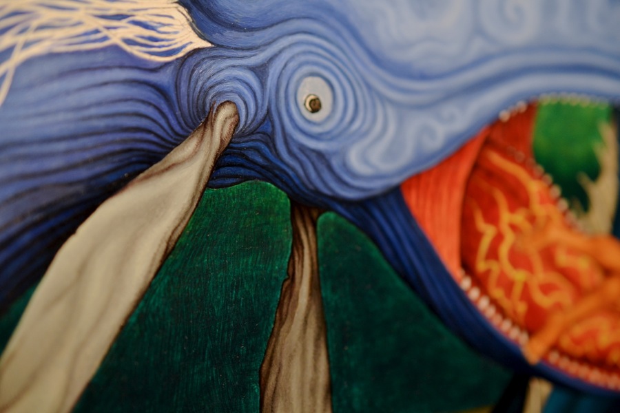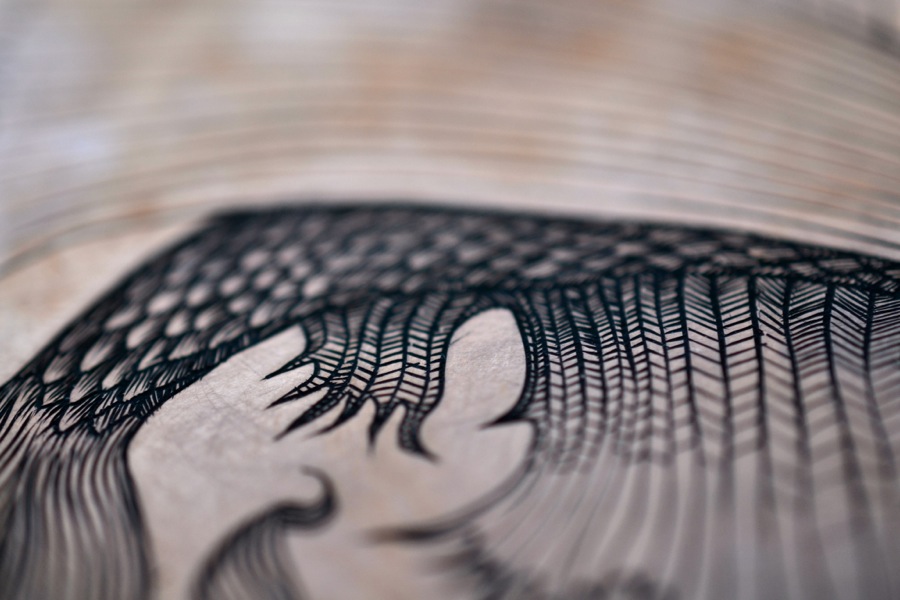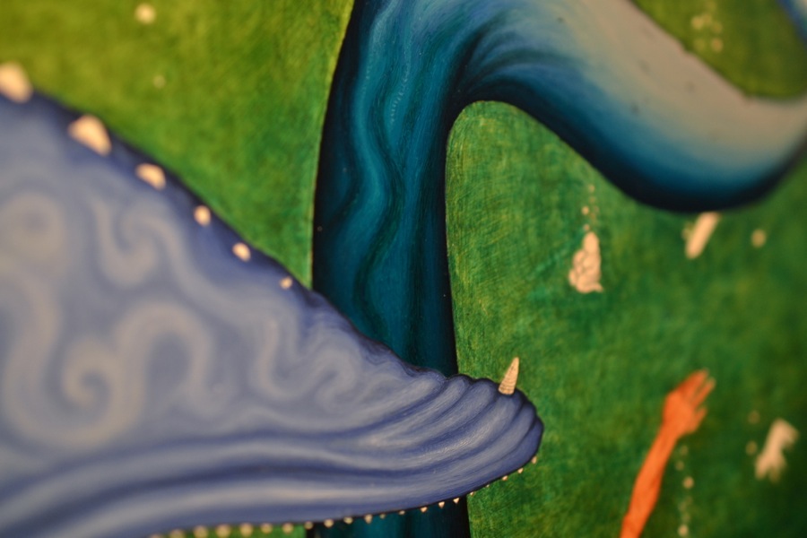 Beautiful. I love how those rich, luscious colours condense to the incised lines in the metal surface. From the temple wall to the sacred manuscript. I positioned the 3rd and 4th images halfway each and contrasted the painted browns (3) with the earthen patina of 4. Now 3 is starting to look like a knife blade, needle and thread and some sort of cosmic umbilical cord. I’ll go out on a limb and say you’ve cut the sea beast free and are stitching up the wounds. (I know, I know, crazy extrapolation!)