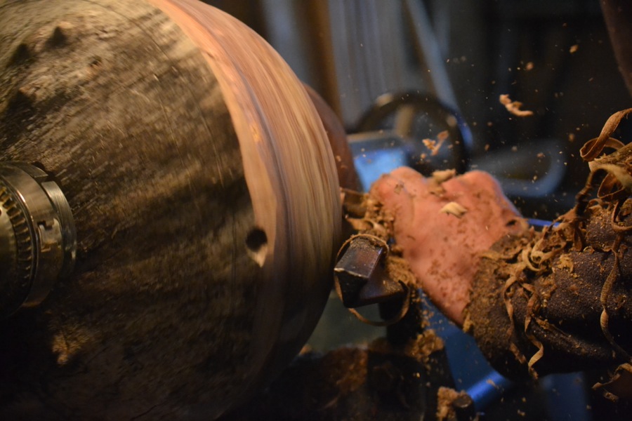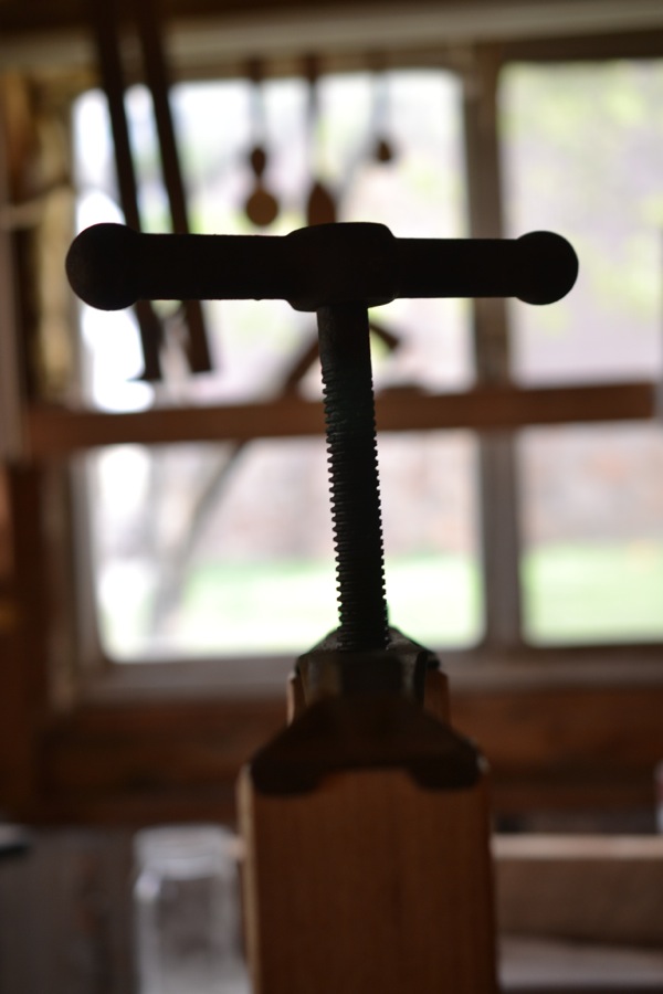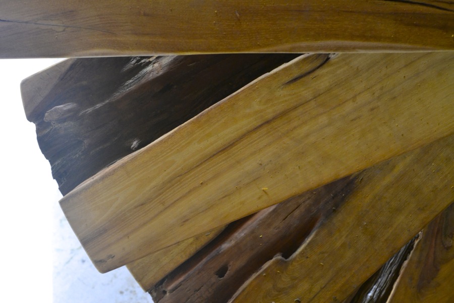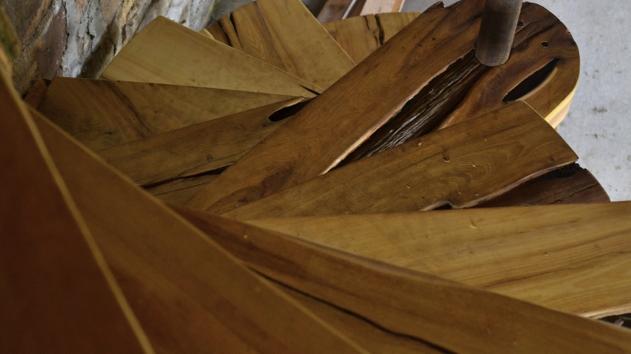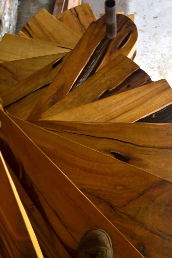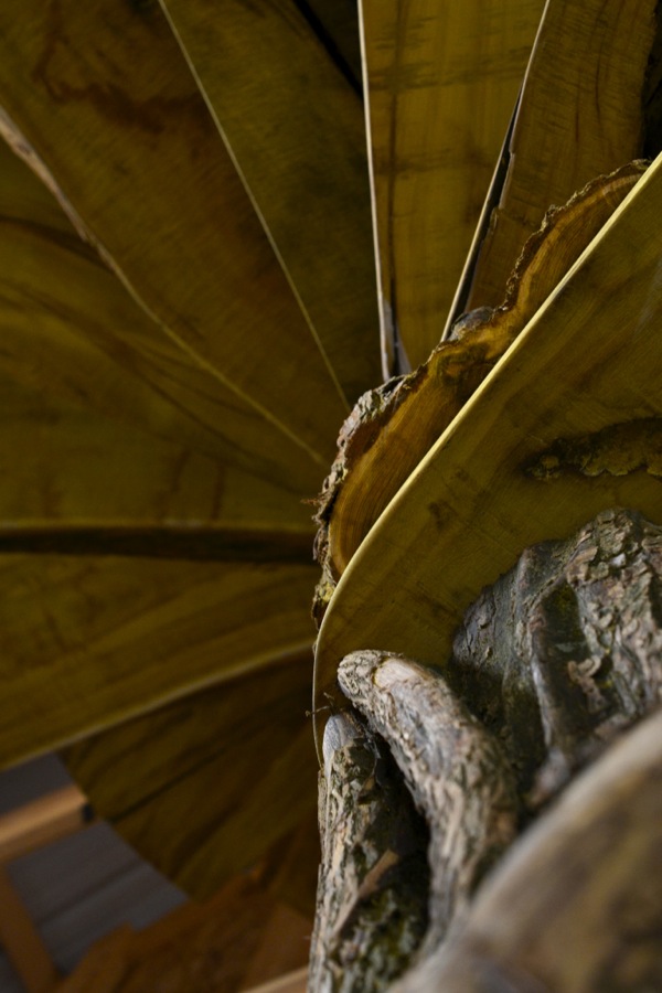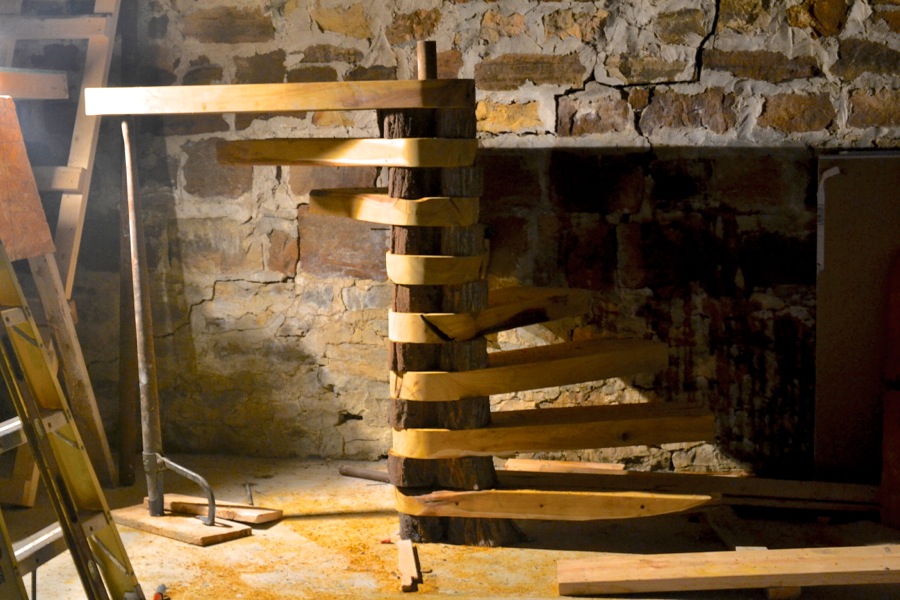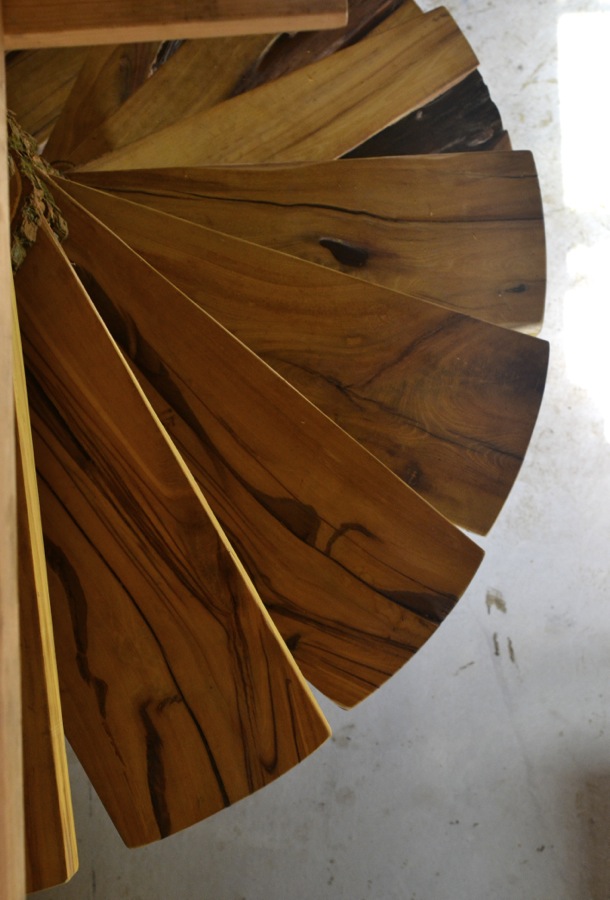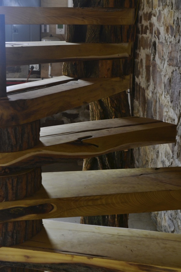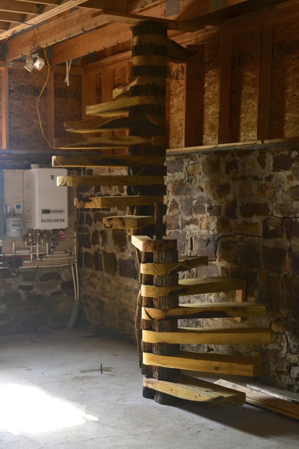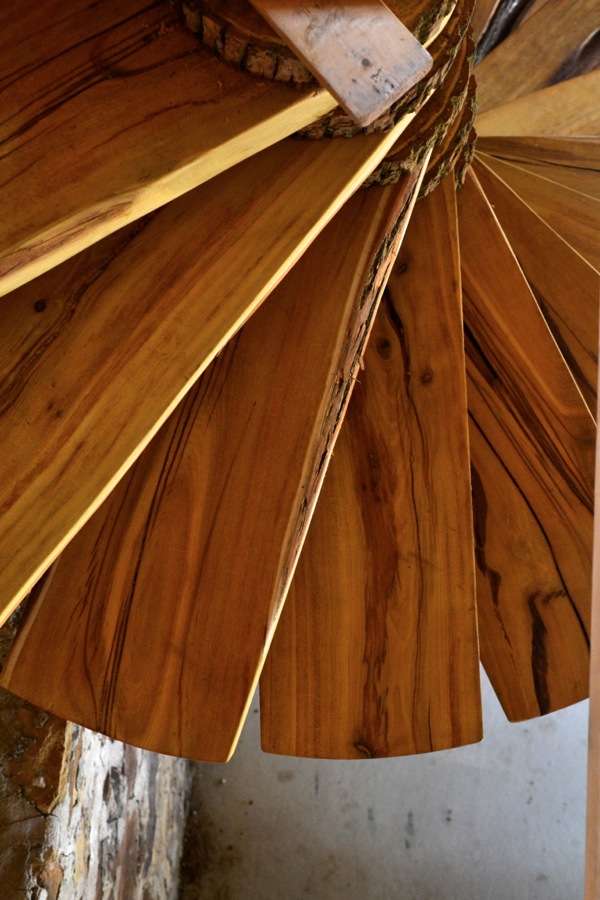 Spiral stair in Hedge (Maclura pomifera, bodark, bois d’ark, osage orange).  Designed by my friend Cody to join a 100 year old barn basement to the floor above.  The barn, just outside of Fall River, got hit by a twister about 4-5 years ago and is now being rebuilt as a workshop and living quarters.  The stair isn’t officially finished, we already have a list of things we want to change, but this is it in it’s first state.