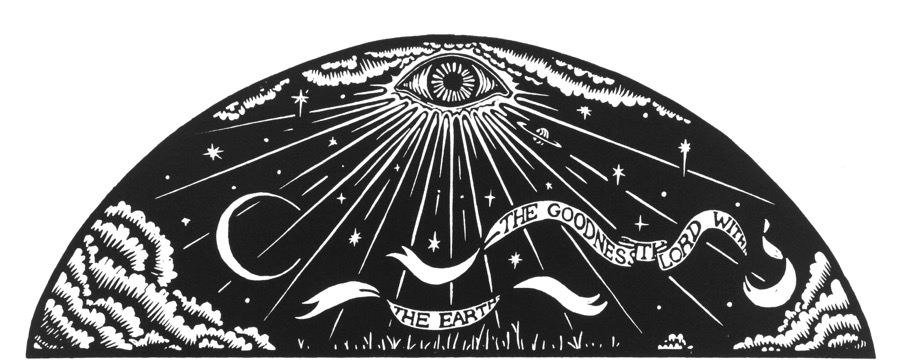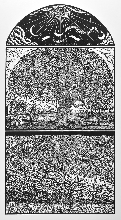 The Spiritual Mechanics of Labor and Rest is a relief print edition carved and printed by hand from a block of linoleum. It is available for pre-order in the Baumwerk Shop. It will be an edition of 100 prints. Numbers 1-75 will be black ink on white paper, while numbers 76-100 will be sepia ink on cream paper. There will be a separate listing for each color option. The black and white prints will be ready for shipping sooner on March 23rd, while the sepia and cream prints will be available a few weeks later.