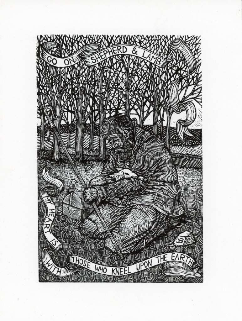 Go On, Shepherd is a new wood engraving available for sale in my online store Baumwerkshop. As a shepherd, often I find myself in this position, kneeling on the ground tending an animal. It is a humble position, yet, to be nearer to the earth by half or more is significant. Don’t forget that you are dust. Great comfort that is. When I learn of the soil I am learning about God, creator and king of the Universe. It is good to be humble, kneeling on His earth.