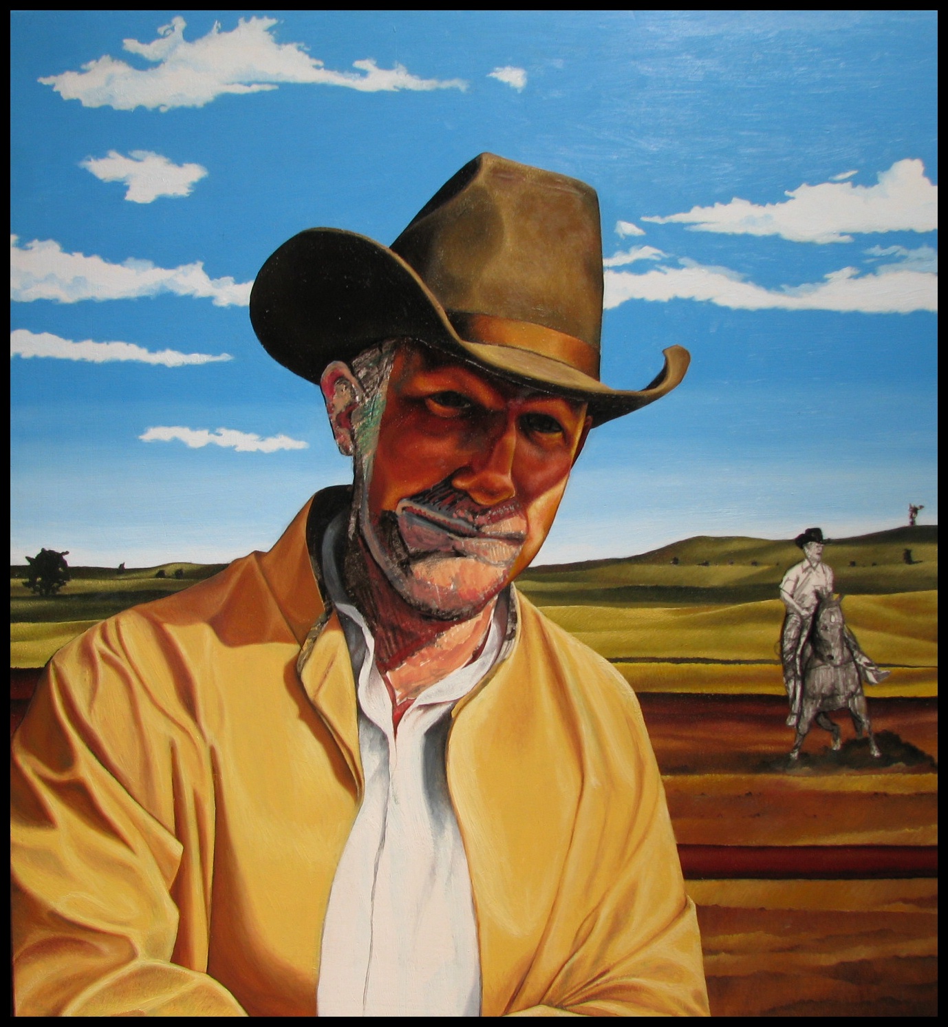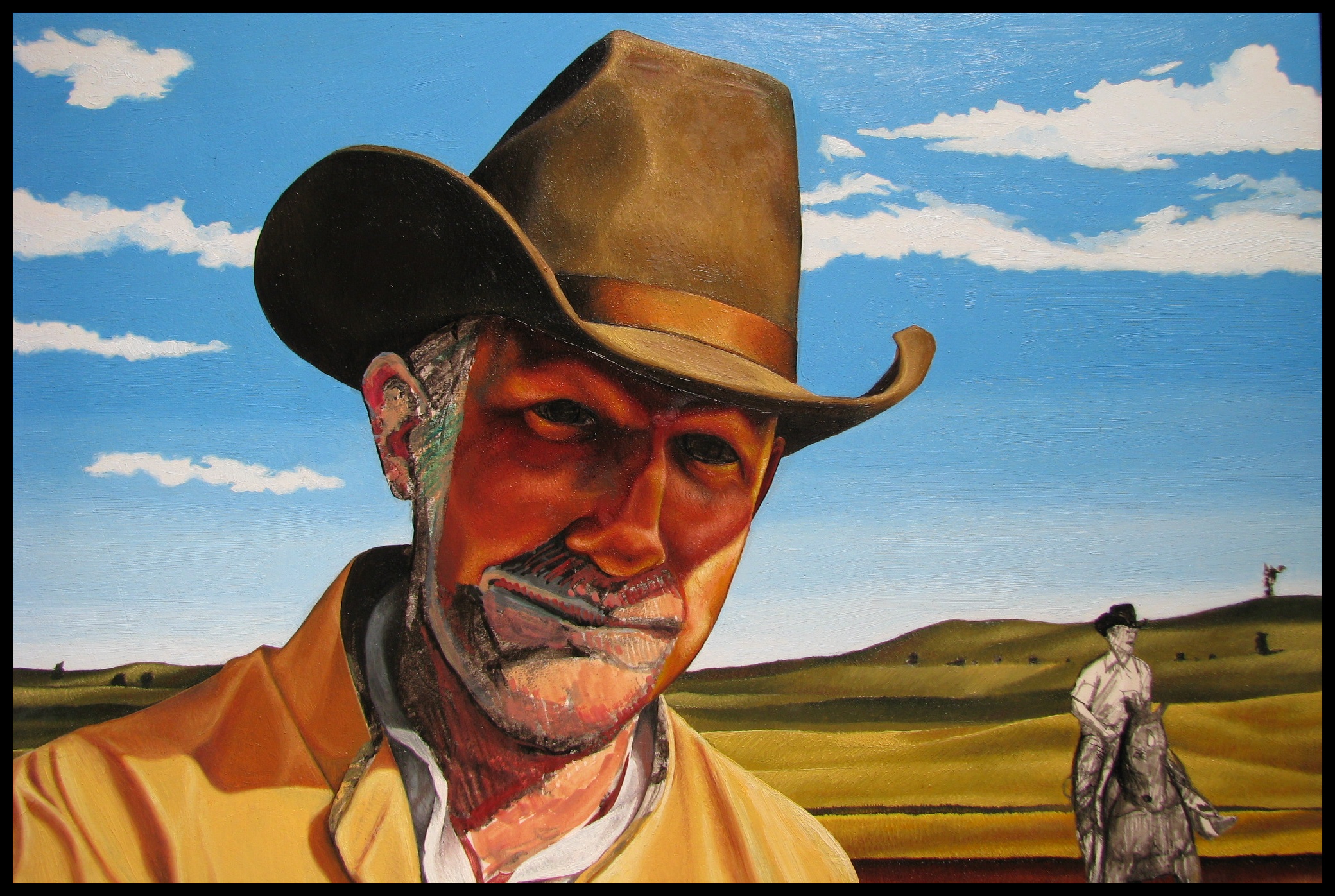 Oil on panel, and in progress, a portrait of the cowboy, Cecil Hendrix, promised many years ago to his son Earl.