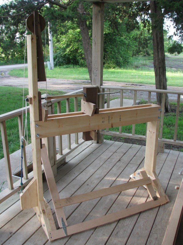 A simple foot operated lathe for turning chair rungs. The frame is dimension pine and the poppets, which house the points and sandwich the piece to be turned are black walnut, with the remaining pieces made of Q.S. white oak. Go to the Traditional Woodcraft page for more on these subjects.