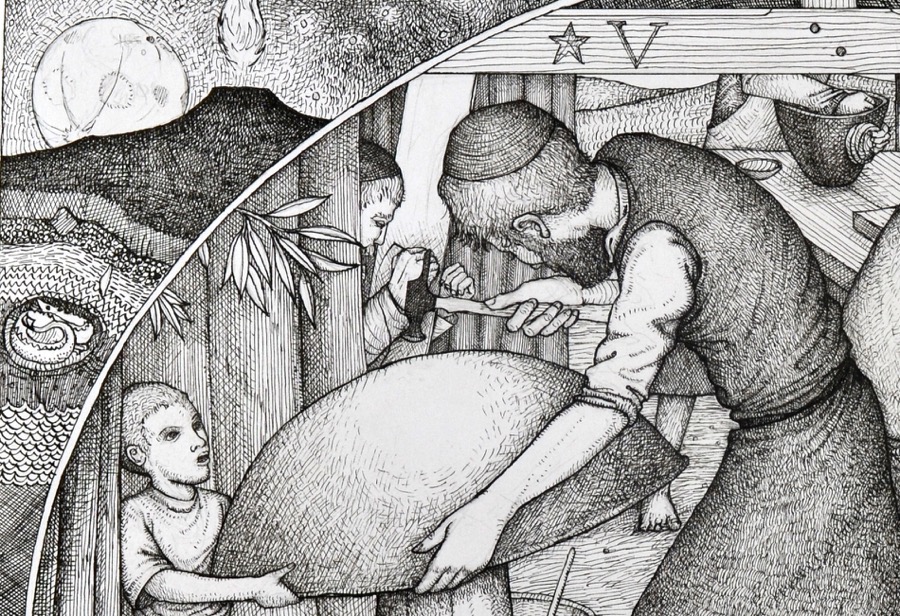 Elizabeth Duffy asked me about influences and progenitors in her interview with me last year. Here is an excerpt of my response pertaining to Bezalel: I hope, maybe, to be in the line of Bezalel, who fashioned so much for the tabernacle, making the sacred things that were part of the “technology” of worship of His God for his community. Personally, I couldn’t ask for more than that. Bezalel is valuable as a paradigm of an artisan of broad experience and skill. He could work in many trades and arts with skill worthy of God’s Tabernacle. My good friend reminds me of the value of a man of that breadth of experience and skill in contrast to a culture that places a premium on experts of high degree in a single field. When I wonder if I am hurting myself by embracing so many disciplines, I am grateful for Bezalel and his place in God’s story, and a few other men I have encountered who are champions of excellence in this way. The drawing, an imagining of a portion of Bezalel’s tent-workshop, started two or three years ago, finally over the past two months I was able to finish it. It is composed along the lines of another drawing, Go On, Adam, Breathe. An potential series of drawings? The drawing to me feels so limited, compared to the vastness of what could be explored and depicted, as a task to learn about Bezalel, his labors, and his relationship to his God.