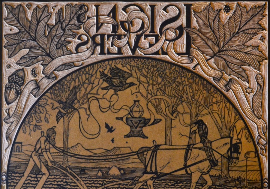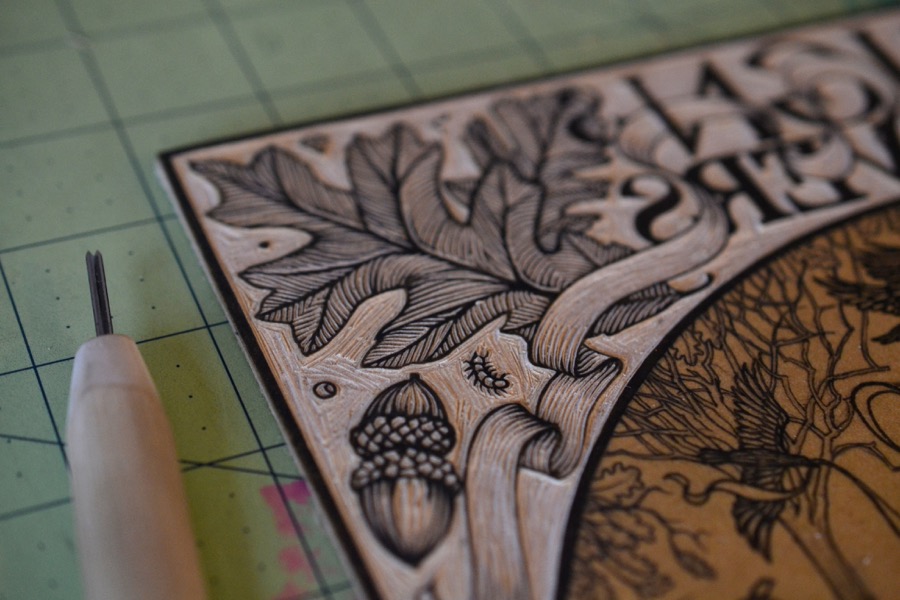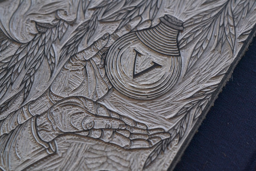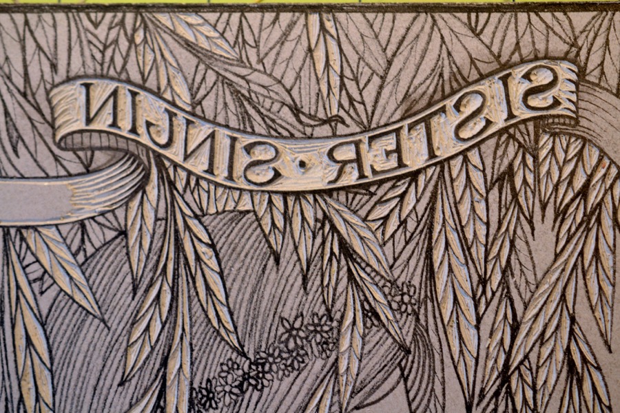 The second entity is the musical trio Sister Sinjin. My good friend Elizabeth Duffy is part of this group of women who sing devotedly to the glory and love of God. This image from this block will become the cover art for their upcoming record. The contemplative spirit of their music really seems to offer a counterpoint to the industrious detail of the print I’m making for Matt. I’ve noticed and appreciated the contrast as I have been working back and forth between these two blocks. The quite offering of the woman and the persistent labor of the plowman. Both have offered a lot of opportunity to grow and develop and express, and I am grateful. There are many photographs of the carving process below, which is still underway in both cases, though I am nearly done with the Sister Sinjin block.