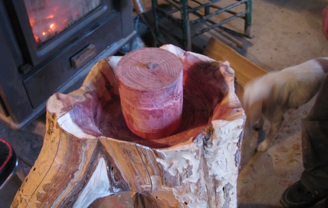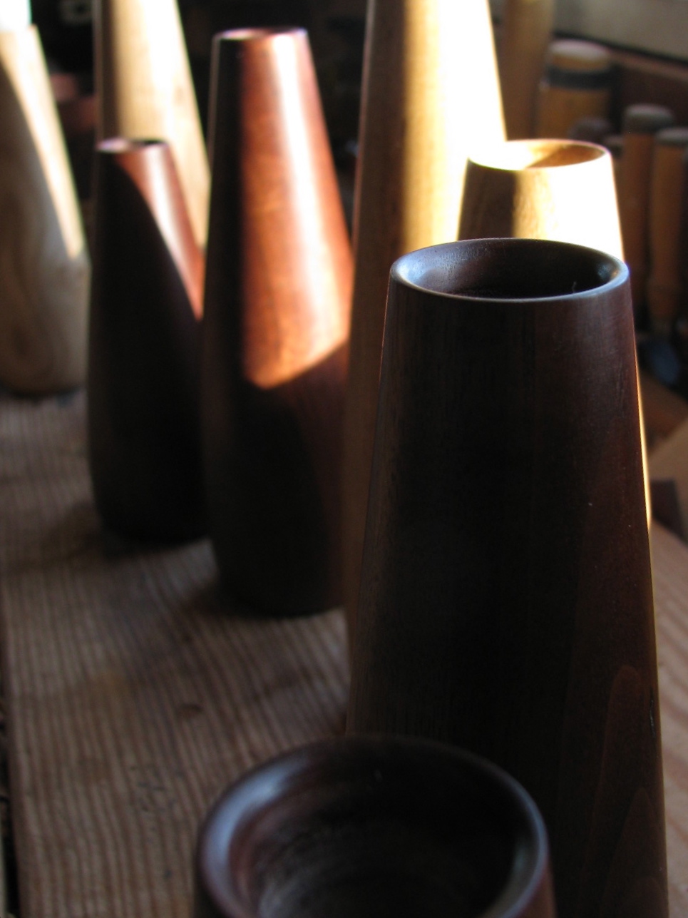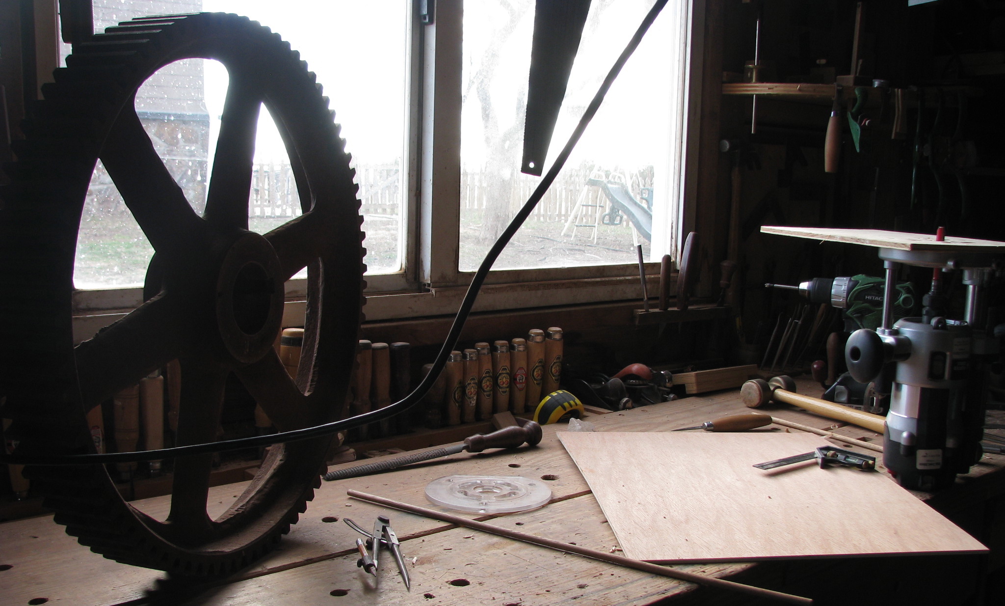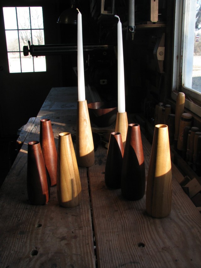 In The Shop (Accidental Tourist) rescued starling; walnut and ash candlesticks; neighbor’s gear and cedar table project