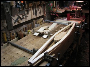 More On Greenwood Chairmaking Ash backslats and back posts being bent. The pieces were split from a log taken from a fellow’s back yard in Wichita, shaved down and bent while they were still green (wet) so that when they dry they will hold their shapes.