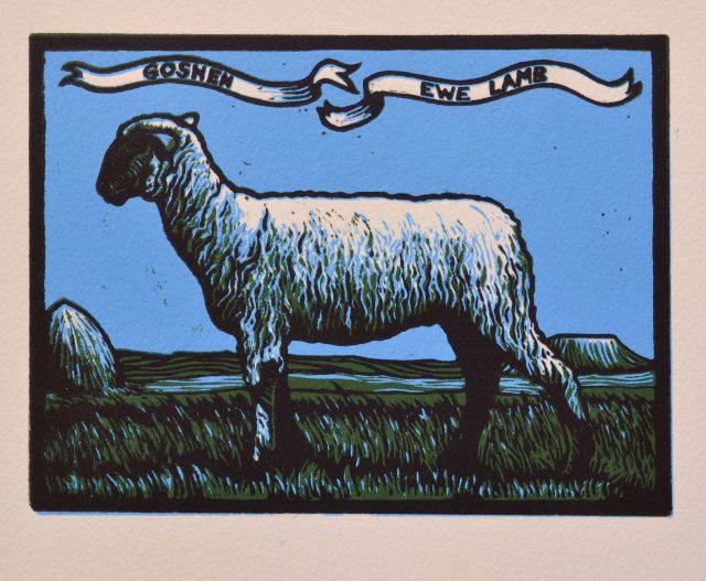 Goshen, Ewe Lamb, color reduction lino-cut, 4.5″ x 6″