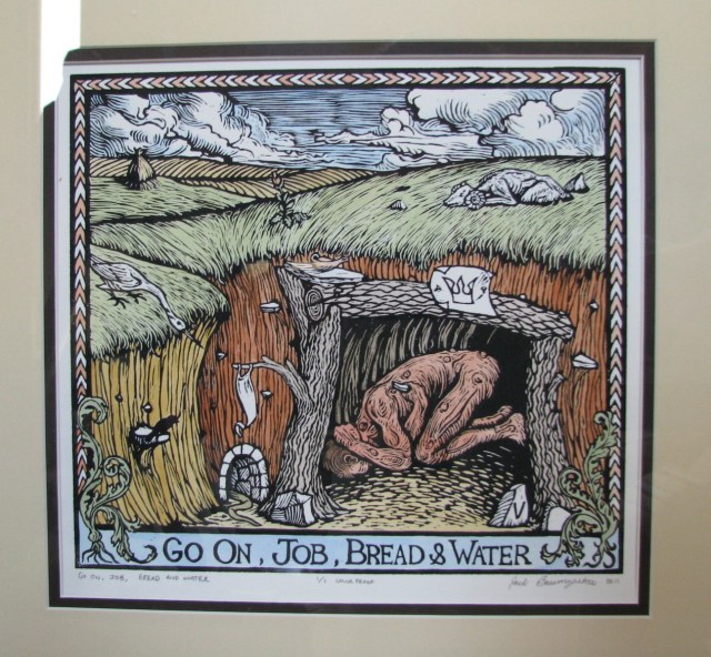 Below are some views of the walnut long-table as well as a colored print of “Go On, Job, Bread and Water” framed in walnut for my friend.