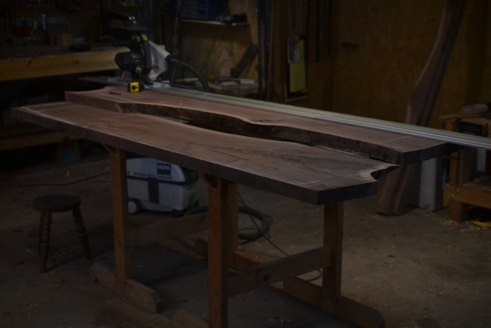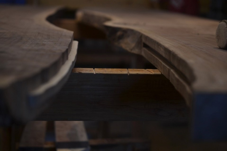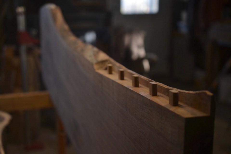 One side of the natural edge was curving away on bottom edge so I had to cut a shallow rebate in order to have a solid joint as well as cleanly scribed edge. This edge was reinforced with dominoes. The opposing edge curved towards the bottom edge and could be cut square. For it I made a floating contoured spline from Baltic birch. Assembled dry all is tight and solid.