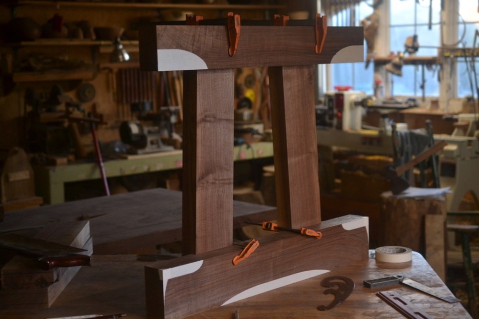 Finding a way to visualize the elements in a design is an engaging challenge. Krenov spoke of “composing”, and I’ve adopted his method and language -clamping up and mocking up relationships as the process moves forward. I don’t recall if he used tape, but I recently switched from using blue tape to white tape to mask off shapes- the difference is remarkable.