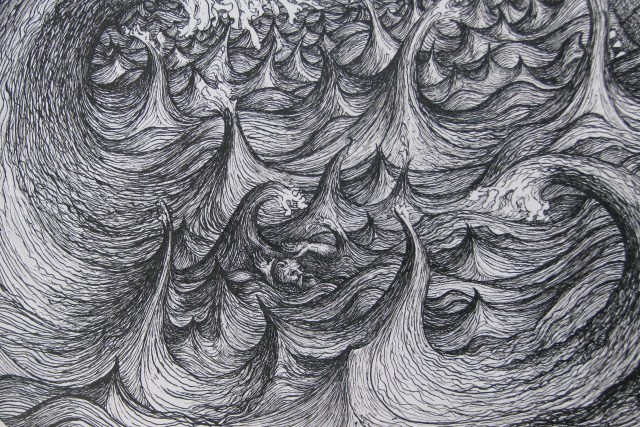 Building layers onto the upper half panel of Walking Man and the Ancient Ocean. Here, the clouds, sky, middle and far landscapes, and the cliff have all been recipients of a second layer on top of the underpainting. Below are two details, and the panel in two previous states.