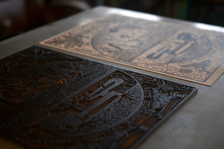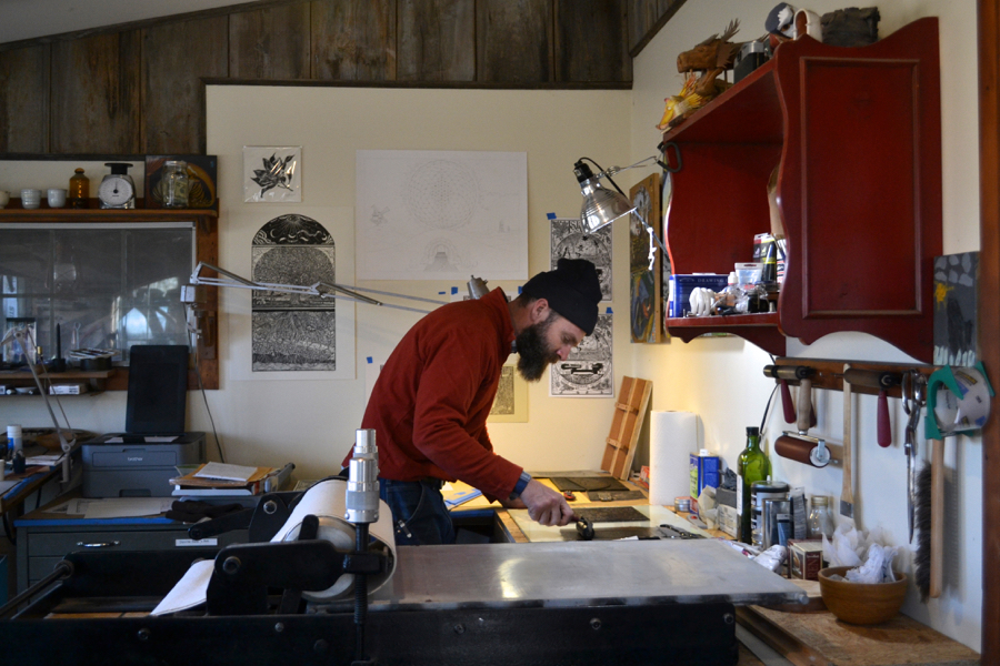 The second entity is the musical trio Sister Sinjin. My good friend Elizabeth Duffy is part of this group of women who sing devotedly to the glory and love of God. This image from this block will become the cover art for their upcoming record. The contemplative spirit of their music really seems to offer a counterpoint to the industrious detail of the print I’m making for Matt. I’ve noticed and appreciated the contrast as I have been working back and forth between these two blocks. The quite offering of the woman and the persistent labor of the plowman. Both have offered a lot of opportunity to grow and develop and express, and I am grateful. There are many photographs of the carving process below, which is still underway in both cases, though I am nearly done with the Sister Sinjin block.