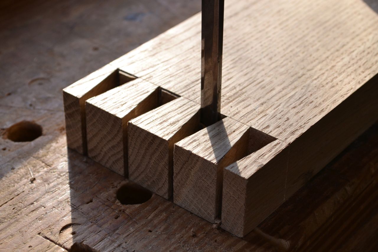In the same contemplative spirit, all of the structural joints are “through” mortise and tenons, with hand cut dovetails on all of the casework and drawers. The hardware are re-purposed spikes from a derelict centenarian railroad bridge located on Cody’s land.