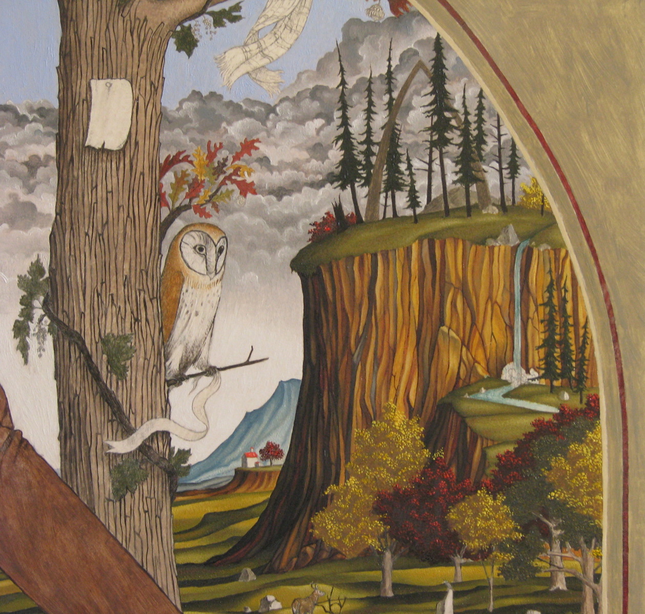 Building layers onto the upper half panel of Walking Man and the Ancient Ocean. Here, the clouds, sky, middle and far landscapes, and the cliff have all been recipients of a second layer on top of the underpainting. Below are two details, and the panel in two previous states.