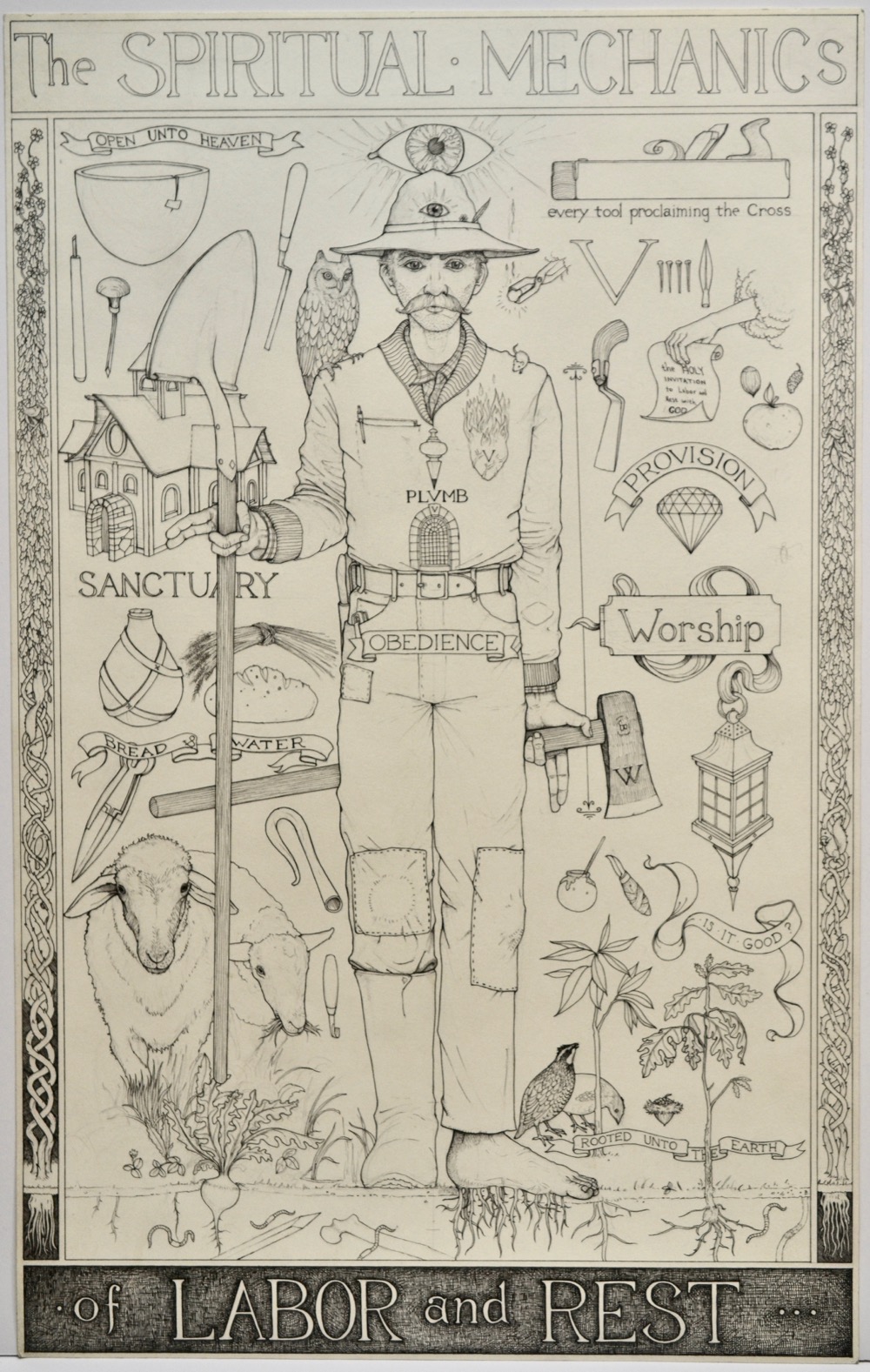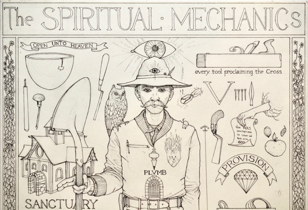 The Spiritual Mechanics… began as a way of building a repository or archive for many of the symbols that help me to understand my place and function in the world and the Kingdom of Heaven. It is, after a fashion, an info-graphic which serves a developing theology around the ancient kinship of labor to worship.