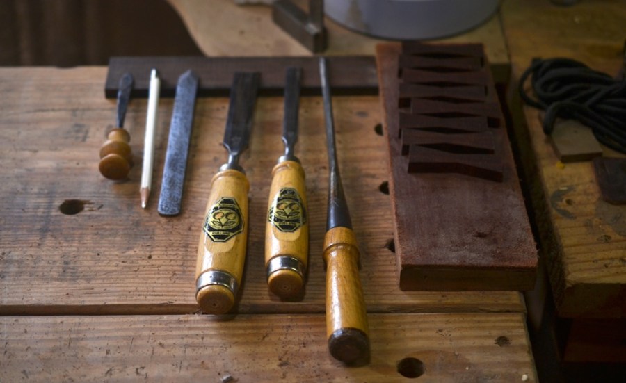 …and are then stuck in place so that they don’t shift when their outlines are being scribed into the top with a knife