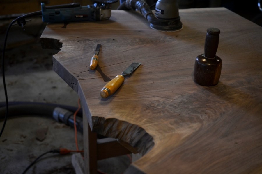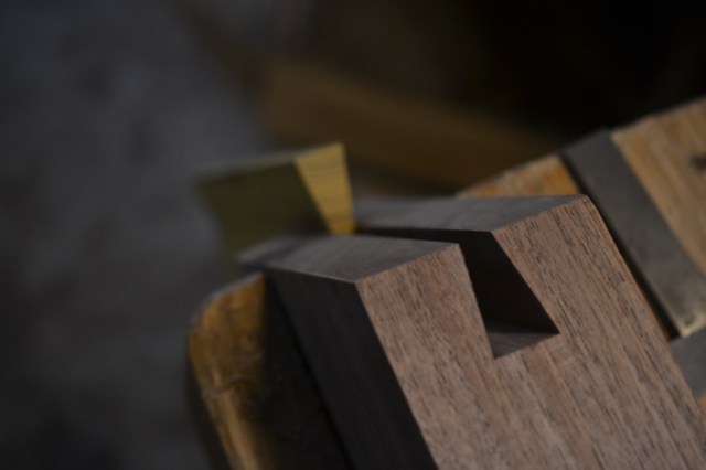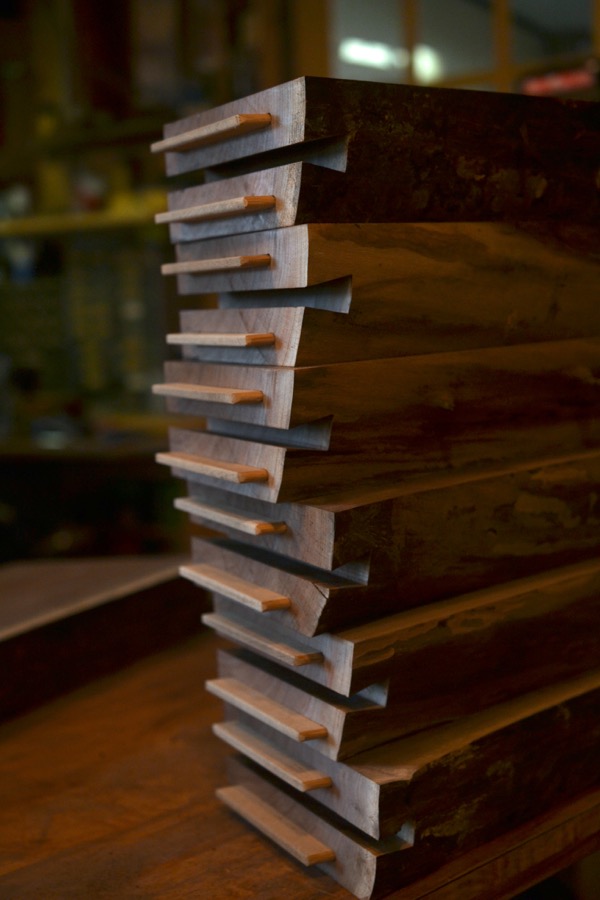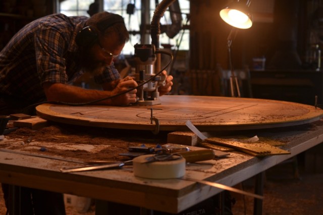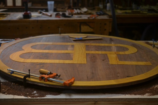 along with the decorative inlays, being positioned here are some butterfly-keys, which help to stabilize the splits and inclusions in the walnut making up the table-top