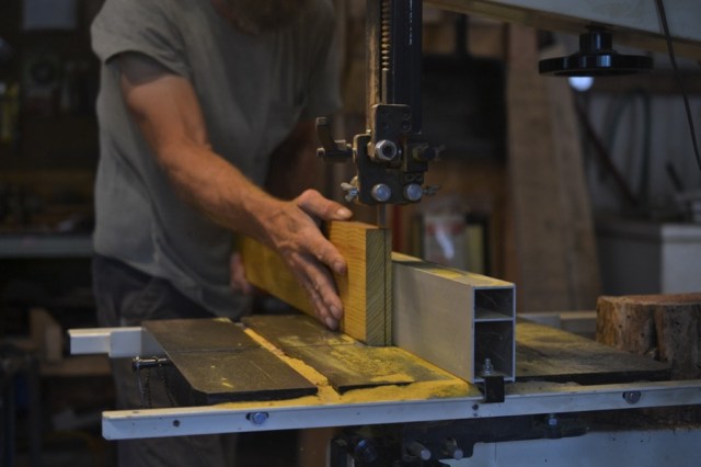 my son roughing out a billet of walnut for some stubby spindles. The spindles will connect the arc to the top-central horizontal rail connecting the leg assemblies, preventing any propensity to rack along the length of the table