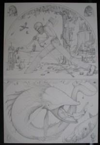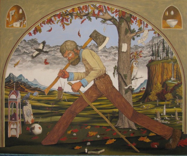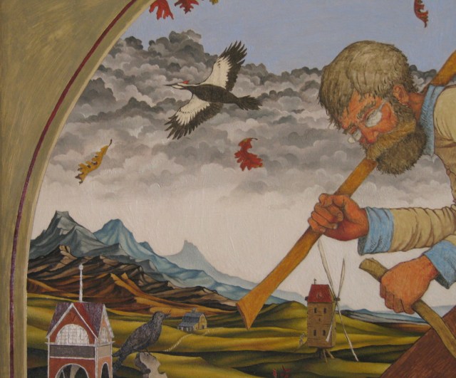 Building layers onto the upper half panel of Walking Man and the Ancient Ocean. Here, the clouds, sky, middle and far landscapes, and the cliff have all been recipients of a second layer on top of the underpainting. Below are two details, and the panel in two previous states.