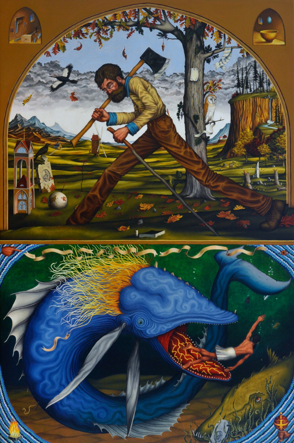 Walking Man, Jonah, and the Ancient Ocean, oil painting on a poplar panel by Jack Baumgartner, 14.5″ x 22″, 2017