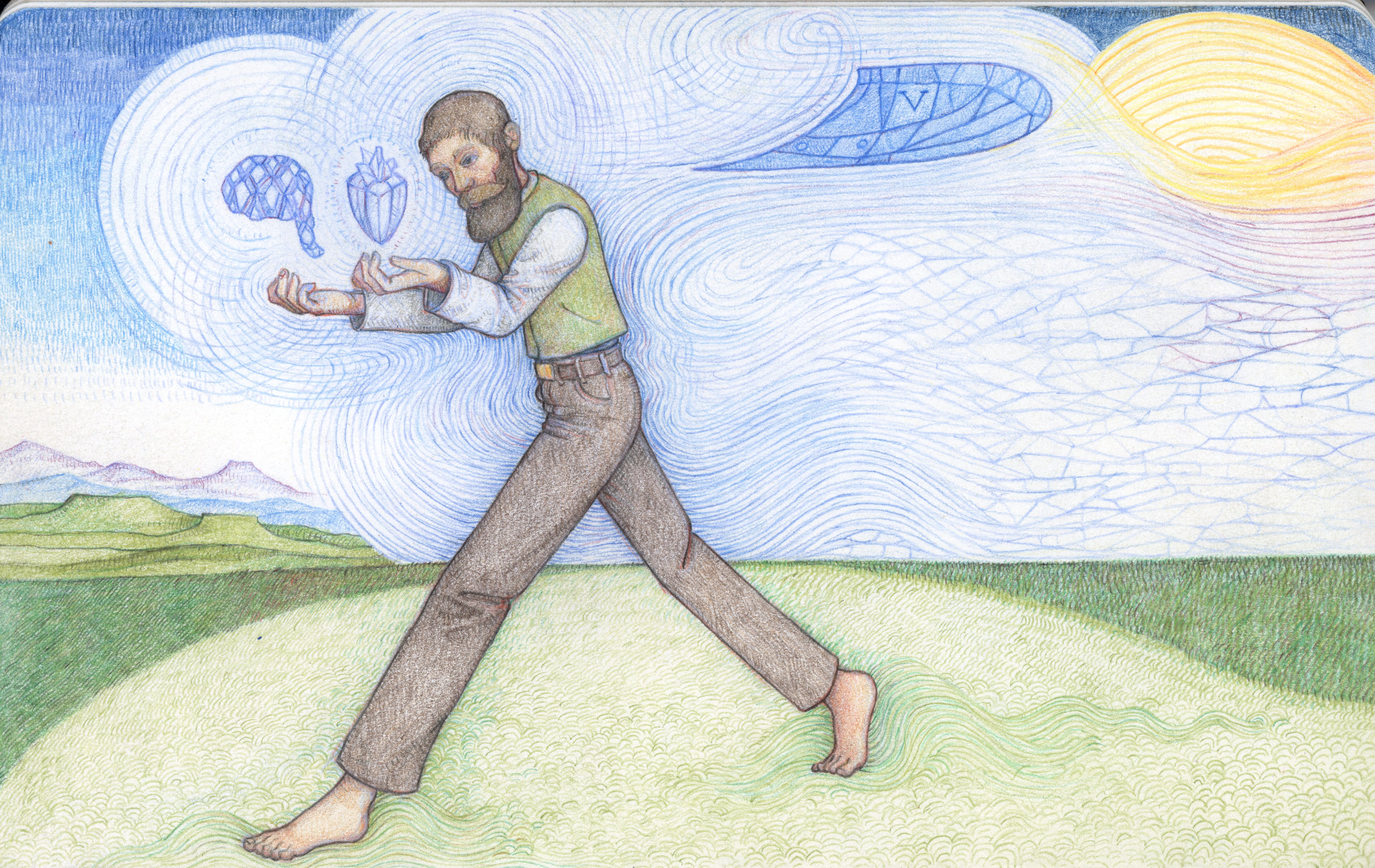 Walking Man, Jonah, and the Ancient Ocean, oil painting on a poplar panel by Jack Baumgartner, 14.5″ x 22″, 2017