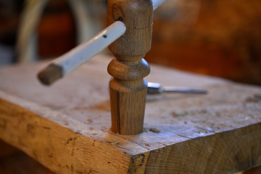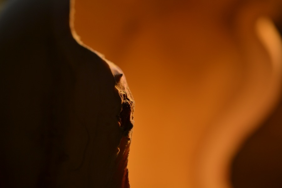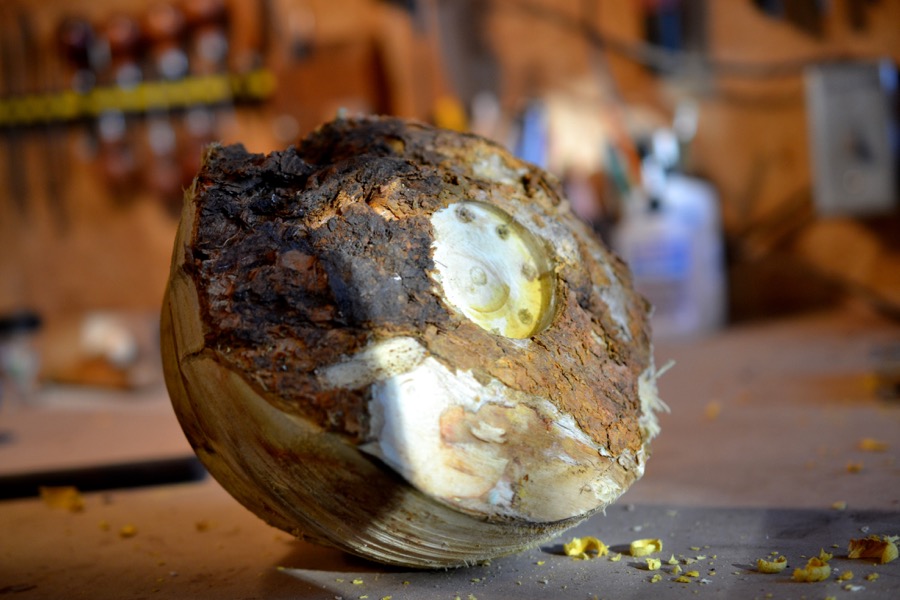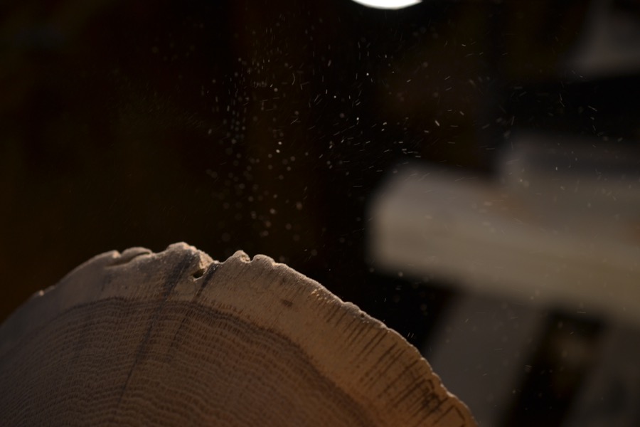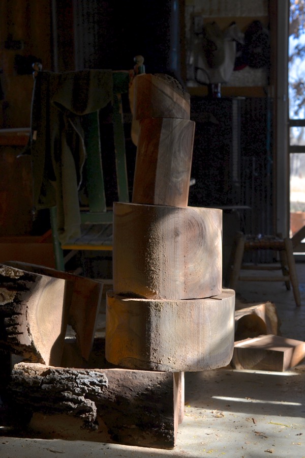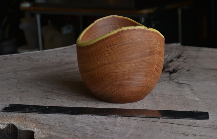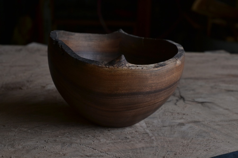 The above are eight turned pieces from a single 24″ section of a 24″ diameter white oak from Boaz, Kansas. The tree fell over and across the Van Horn Branch Creek about 10 years ago- We finally pulled the log out 2 years ago, and it has laid in my log pile since then, although I did mill a portion of it. The heart wood is still green, so these bowls were turned green and allowed to warp as they dried. Ultimately all the pieces were exposed to ammonia vapors (fumed) which reacted to the tannins in the wood, darkening the surfaces.
