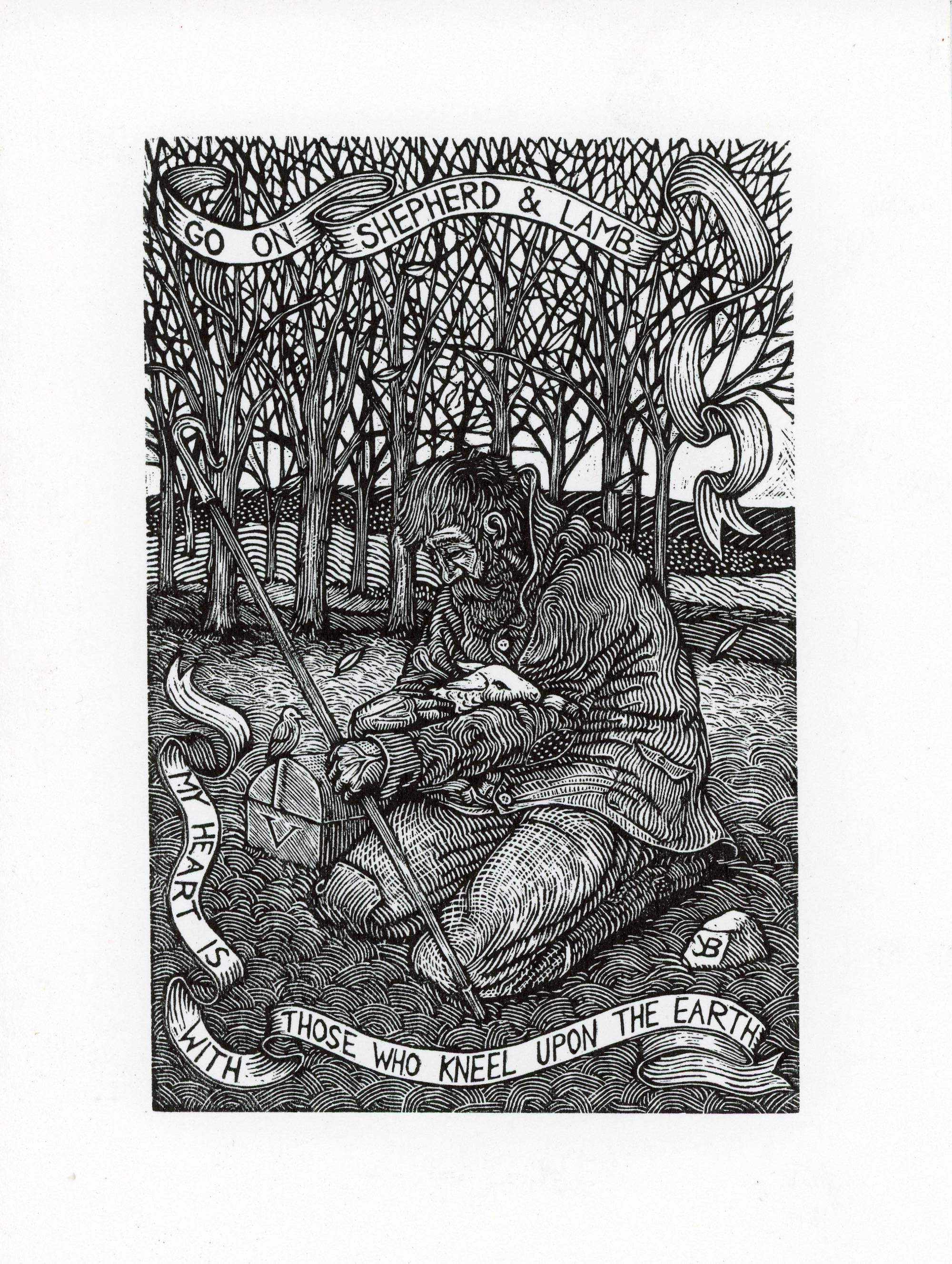 Mary Magdalene and the Yellow Headed BlackbirdVox UniversiGo On, ShepherdThe Stone HefterThe Spiritual Mechanics of Labor and RestMy Way Is the Way of the PilgrimGo On LancelotSanctuaryFlying FishGo On, Old PilgrimSaint ChristopherGo On, John the BaptistPortrait of a Carthusian after Petrus ChristusZechariahGo On, Job, Bread and Water hand coloredZechariah Proof 3Goshen, Ewe LambDove and Ringsdove detailGo On, Job, Bread and WaterZechariah ColorJacob Wrestling the Angel of GodThe First Beautiful DayWalking Man in the Tallgrass PrairieWalking Man, Fire and GravelGo On Living TreeGo On Obed EdomThe Spiritual Mechanics of Labor and Rest